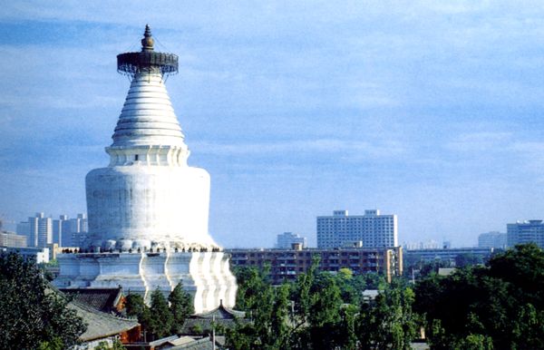 妙应寺白塔始建于元朝至元八年(公元1271年),由元世祖忽必烈亲自勘察选址、尼泊尔工艺家阿尼哥设计建造。塔体砖石结构,高50.9米,由塔座、塔身和塔刹组成。塔座为三层须弥座式;塔身为覆钵式;塔刹由硕大的下大上小13重相轮,托起一个直径为9.7米的巨大铜制华盖,其周边垂挂着36片带有佛字和佛像的华盖,下面各系一个风铎;刹顶为铜制鎏金小型佛塔。